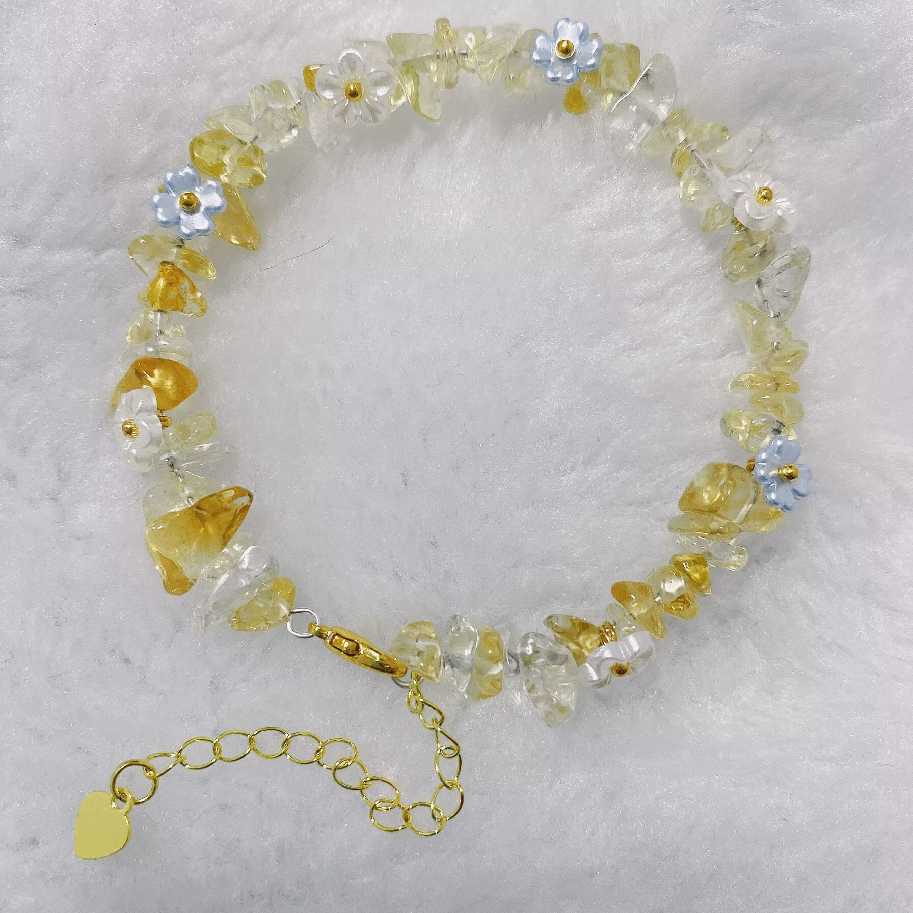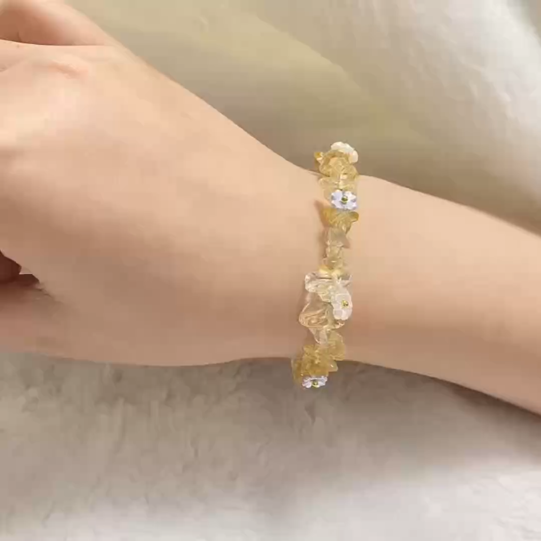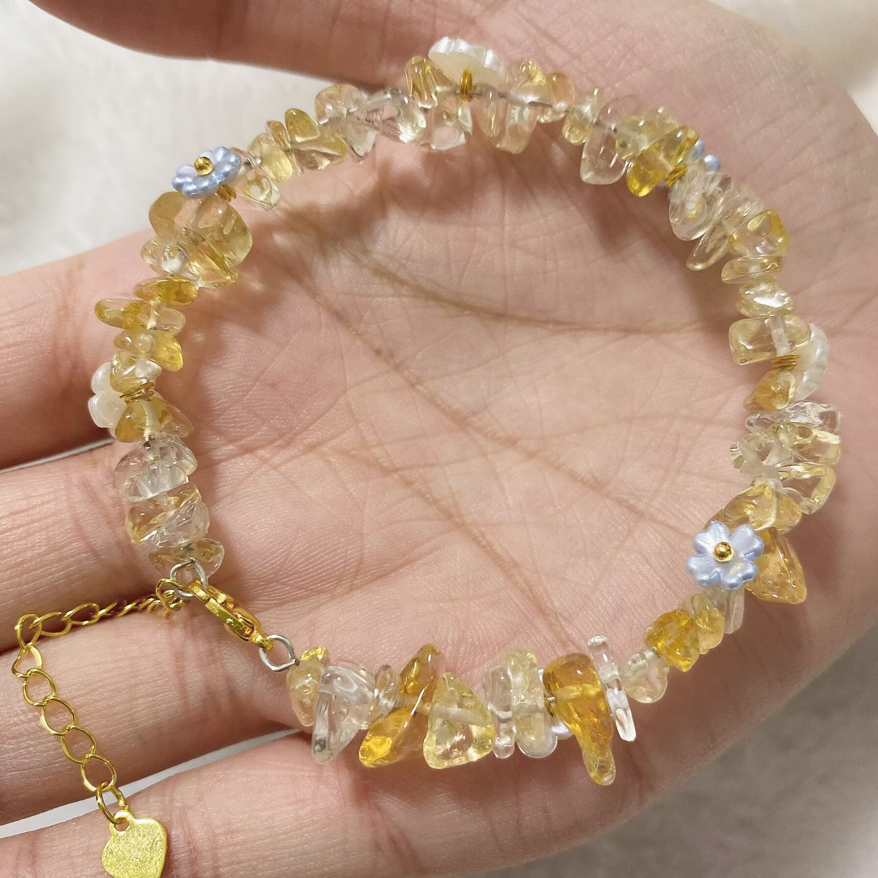 这款天然市黄水晶碎石手链,以通透透清凉的黄水晶为主体搭配清新小花配饰,整体漂亮又灵动,黄水晶是能量石能辅助净化负能量,舒缓焦虑与压力。带来阳光般的积极正能量,助你重拾好心情,增强自信与行动力。